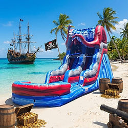 Transform your backyard into a high-seas adventure with the Ocean Battle Water Slide! Standing 15 feet tall, this impressive inflatable challenges riders to "escape" the clutches of a giant squid. Kids will climb past the 3D tentacles to an 8-foot high platform before plunging down the wave-themed lane into a refreshing, attached deep pool. Ideally sized for most yards at 28 feet long, it features high-visibility safety netting at the top to ensure every slide is safe and controlled. It’s the perfect centerpiece for any pirate, mermaid, or ocean-themed party! CAPACITY: Recommended maximum occupancy of 2 RECOMMENDED AGE: 6+ years SIZE: Inflated Dimension of 28L x 13W x 15H